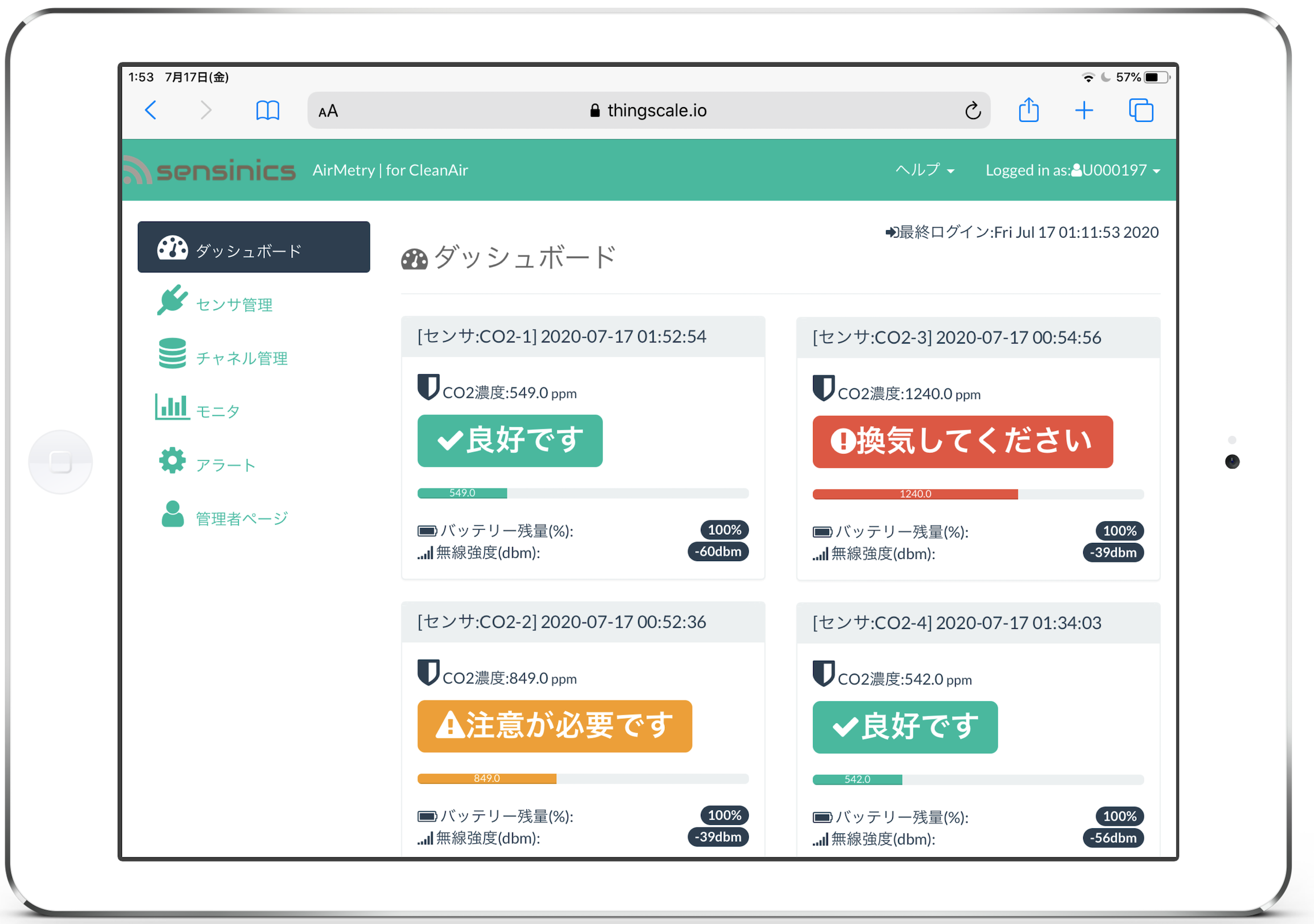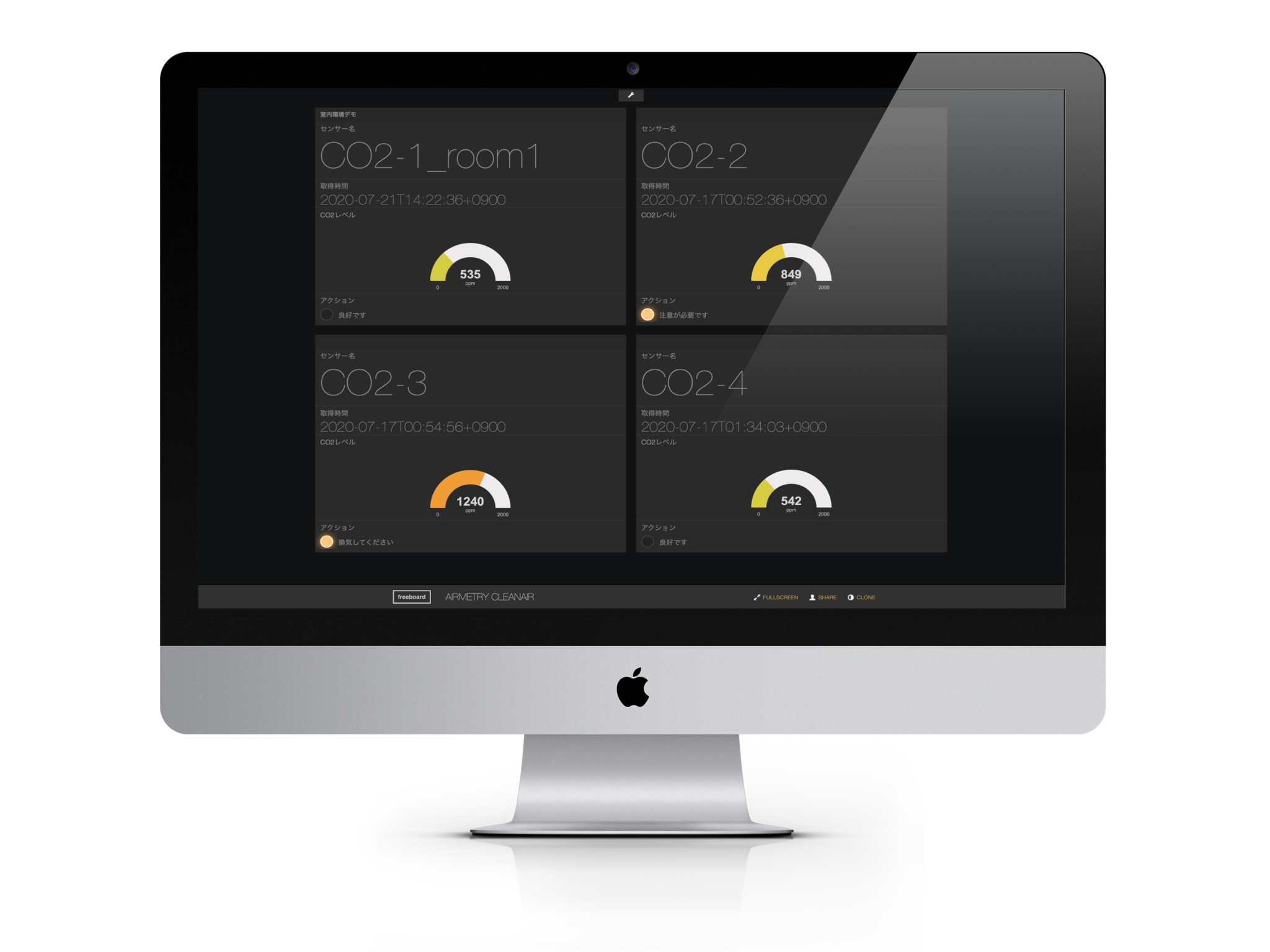 ダッシュボード画面に現在のCO2濃度と3段階の状態(緑・黄・赤)を一覧表示します。 スマホ・タブレットからいつでも・どこでも確認できます。
