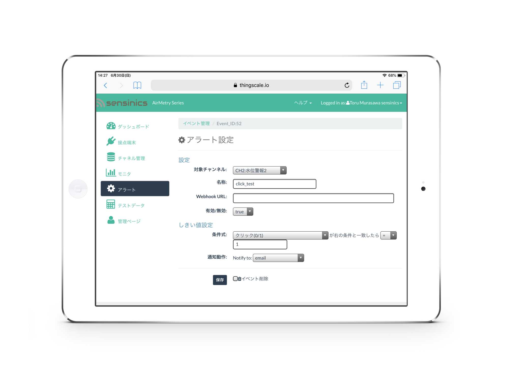 接点端末ごとに、閾値に応じたアラートを設定可能です。 EメールまたはWebhook※で、24時間365日現場の異常を通知します。